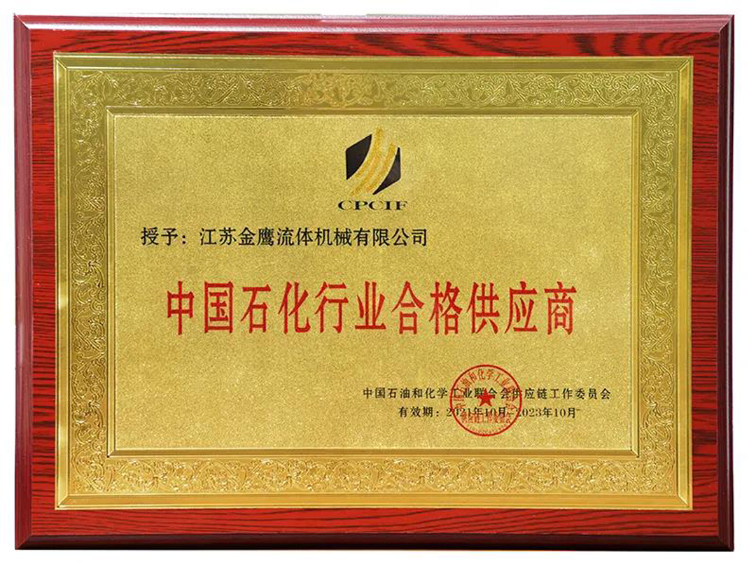 江蘇金鷹流體機械有限公司榮獲了由中國石油和化學(xué)工業(yè)聯(lián)合會供應(yīng)商鏈工作委員會頒布的《中國石化行業(yè)合格供應(yīng)商》證。