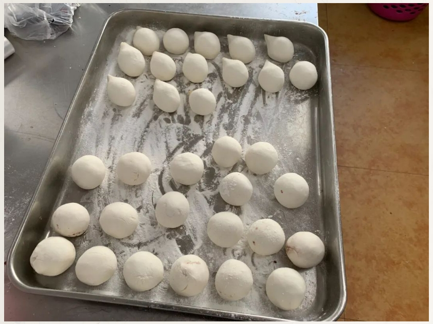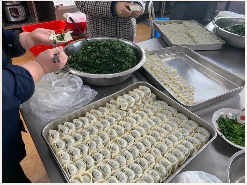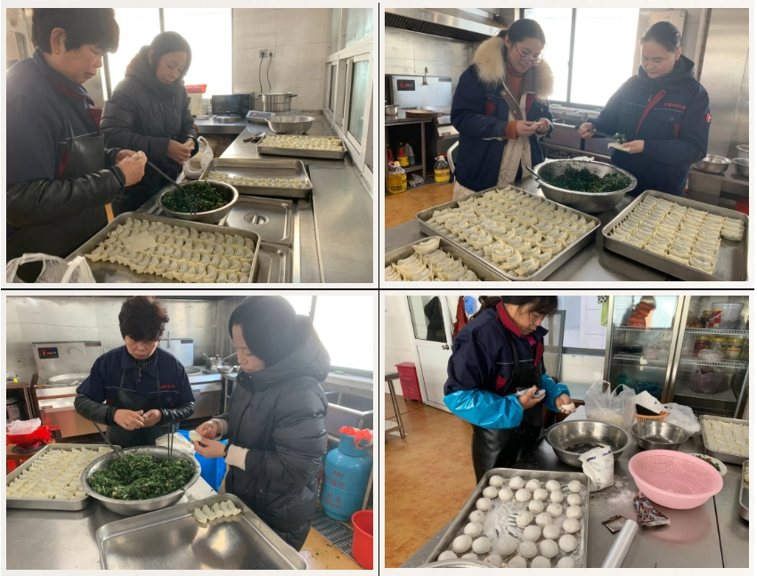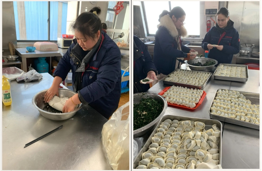 大家分工協(xié)作,和面、調(diào)餡、包餛飩,整個(gè)過程井然有序有條不紊,整個(gè)食堂洋溢著節(jié)日的喜慶氛圍。