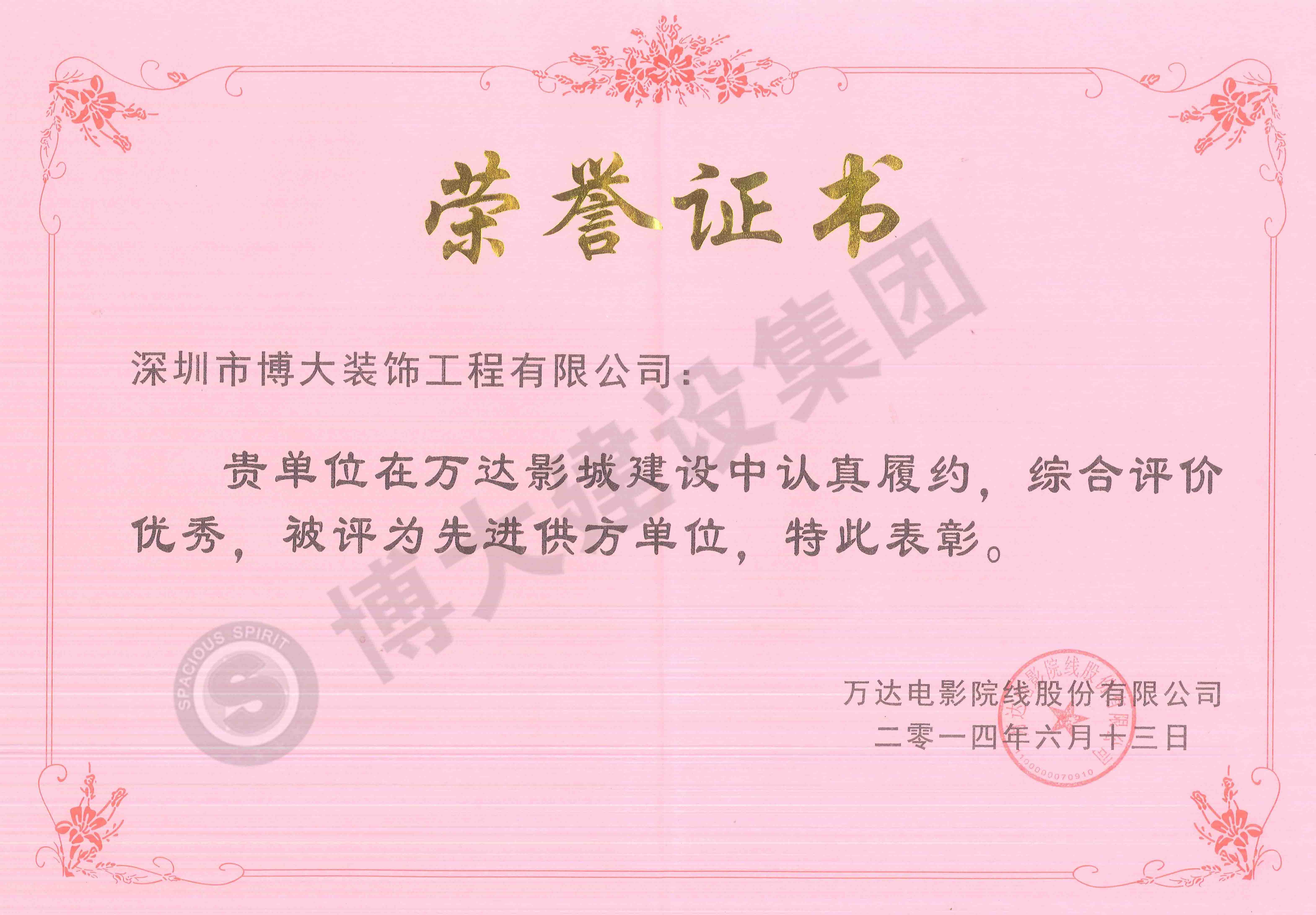 榮獲萬(wàn)達(dá)影城先進(jìn)供方單位