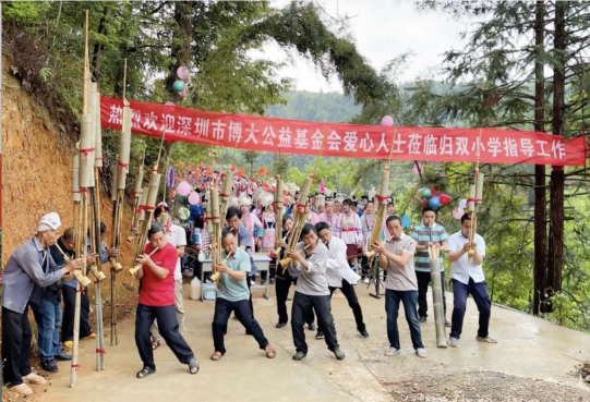 4月21日至22日,深圳市博大公益基金會理事長、集團董事長張炳來前往貴州省黎平縣實地考察擬捐建學校場地,并回訪2021年交付當?shù)卣褂玫膭諏I小學。當?shù)厝罕娸d歌載舞,熱烈歡迎理事長張炳來的到來。