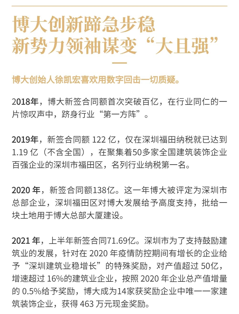 10年時(shí)間,博大業(yè)績(jī)實(shí)現(xiàn)了從10億到138億的高速增長(zhǎng),從默默無(wú)聞到行業(yè)知名,屢屢創(chuàng)造發(fā)展奇跡。2019年成為深圳市福田區(qū)行業(yè)排名第一的納稅大戶;2020年成為深圳市總部企業(yè);2021年榮獲深圳市政府建筑業(yè)穩(wěn)增長(zhǎng)獎(jiǎng)勵(lì),成為行業(yè)唯一一家獲此殊榮的裝飾企業(yè)。