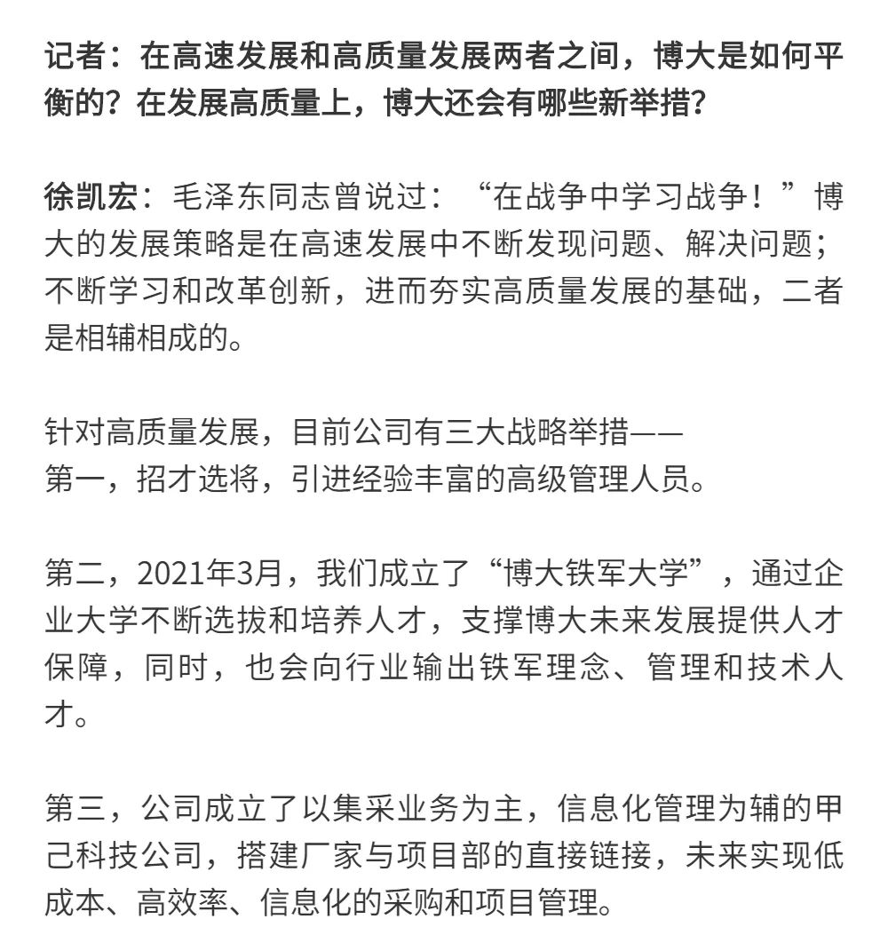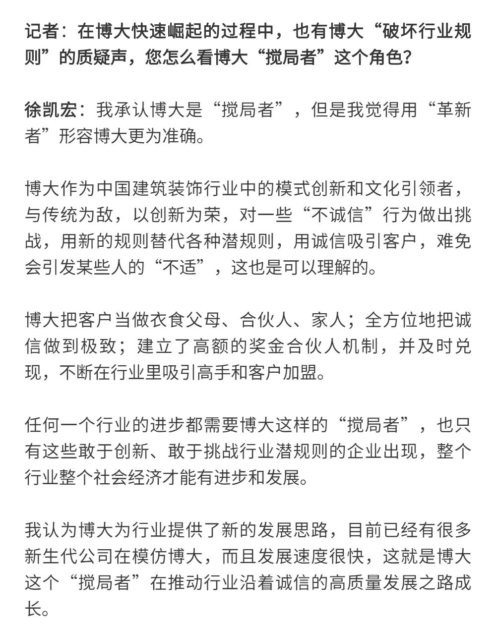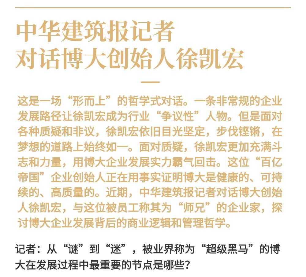 博大以雷霆之勢(shì)迅速崛起,吸引了行業(yè)的高度關(guān)注,行業(yè)權(quán)威媒體《中華建筑報(bào)》數(shù)次深入博大一線調(diào)研走訪,并對(duì)創(chuàng)始人徐凱宏先生進(jìn)行了坦誠(chéng)的訪談,以探討和總結(jié)博大發(fā)展的秘籍,并寫就了《進(jìn)擊的博大:從高速到高質(zhì)量的創(chuàng)新逆襲》和《對(duì)話徐凱宏 | 博大正沿著高質(zhì)量發(fā)展道路堅(jiān)定前行》兩篇文章。